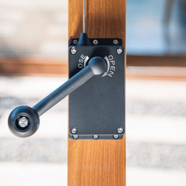 Manivela con doble sistema de poleas y cuerdas para fácil y liviana apertura del Quitasol.