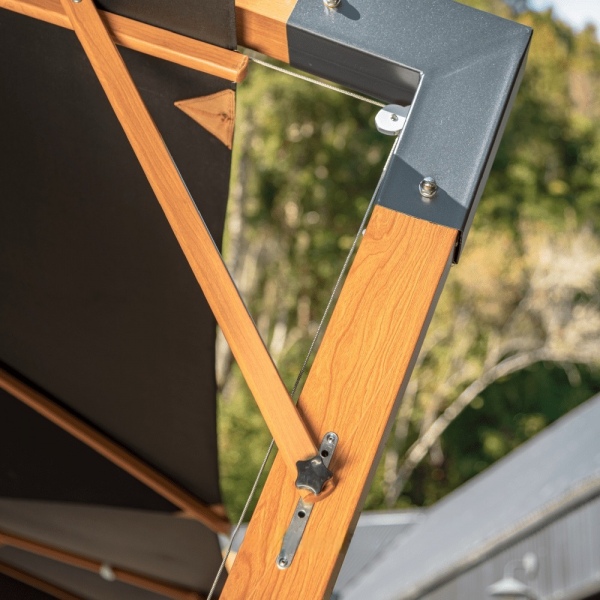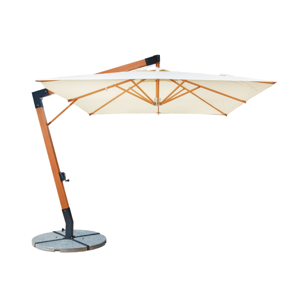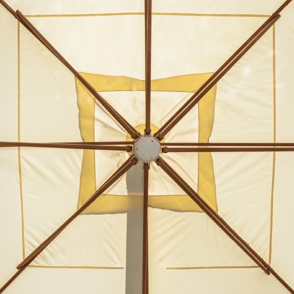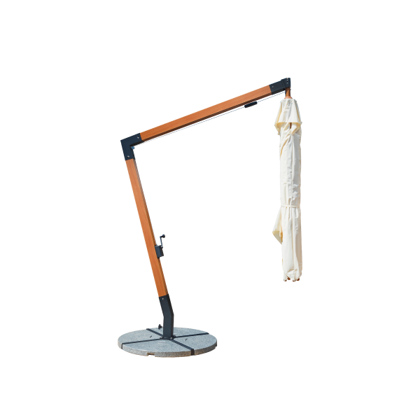 Estructura de aluminio y tela de acrílico con efectos anti-moho y tratamiento anti rayos UV, retardando la decoloración prematura, El tejido brinda una excelente protección contra los rayos UV. La manivela facilita abrir y cerrar el paraguas. La correa de gancho y lazo mantiene la tela en su lugar cuando está doblada.