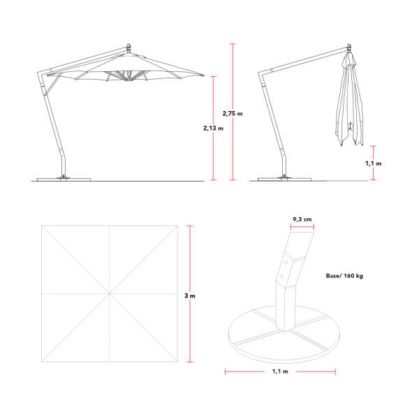 Base de Acero pintado blanco. Contiene orificios y 4 pernos para anclaje. Para quitasoles con asta de Ø60mm.
