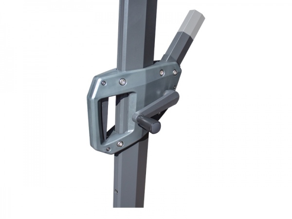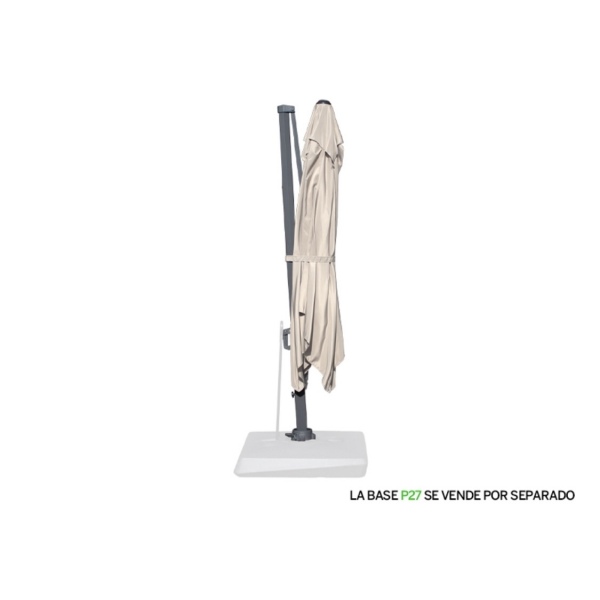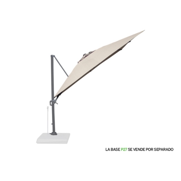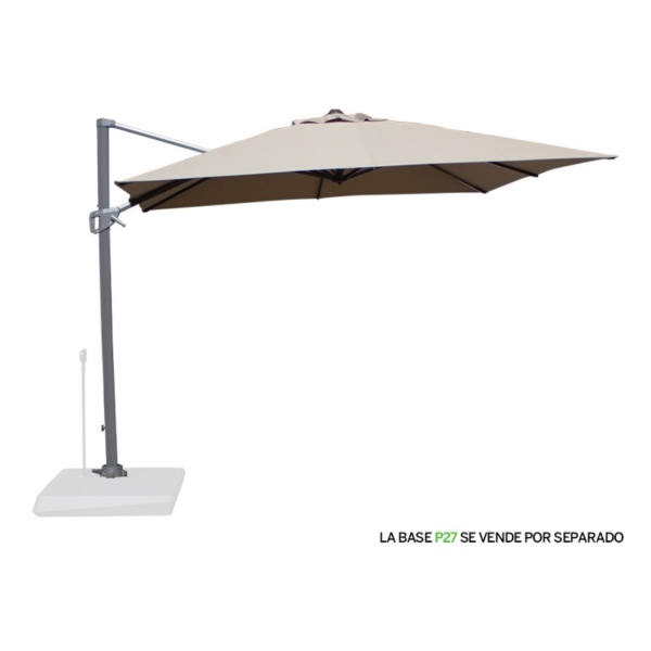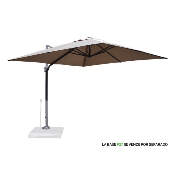 Quitasol lateral cuadrado Beige de 3x3m, con 4 cascos de lona Poliéster UV impermeable de 200g. Contiene asta de Aluminio de 80x50mm x 2.47m de altura y 8 varas de acero. Sistema de apertura manual con regulación de altura y ángulo para sombra. Sistema manual de rotación 360°.